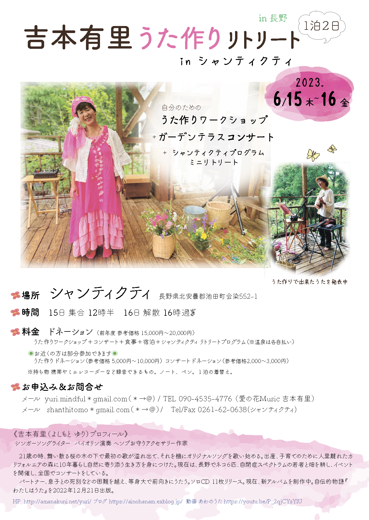 | 6月15日(木)~16日(金) | 長野 | 吉本有里 うた作り リトリート1泊2 日 チラシ表 チラシ裏 |