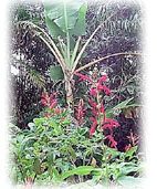 庭のバナナの木の前に咲くパイ ナップルセージの花 |