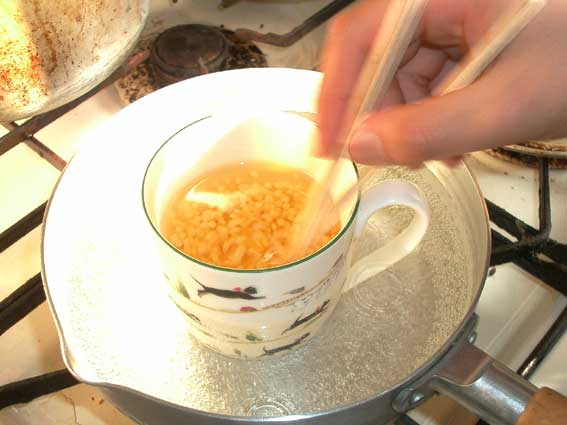 まずはミツロウの粒を湯煎にかけて溶かします。溶けてきたらホホバオイルも加えてさまします。
