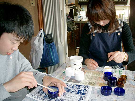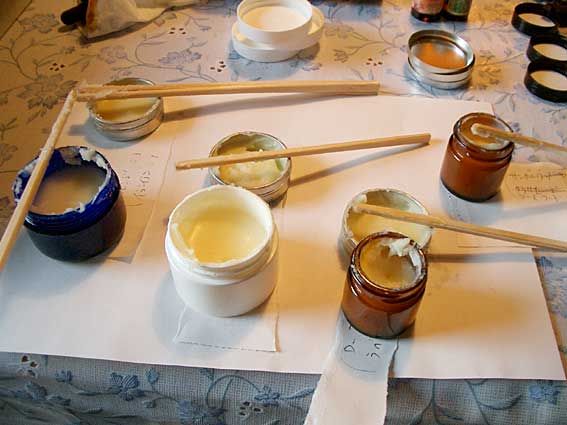 溶かしたミツロウ+ホホバオイルがさめきらない液体状のうちにクリーム容器に入れます。