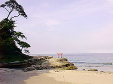 白浜神社は海のそばにありますが、小山を背にしているので海は見えません。ところがぐるっと横から回るとすぐに海岸に出ます。白浜というだけあって細かい白い砂の浜で、沖にはサーファー達の姿が。 写真の真ん中に小さく見える鳥居は海に向かって立っていて、ちょうどそのバックに遠く伊豆大島が見えます。左の松の木が生えている崖のような所は「お釜」と呼ばれるすり鉢状の噴火口のような場所の外側にあたります。22日の朝日を迎えたのは、そこを海沿いに左へまわりこんだ岩場でした。 |