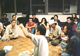 10.24夜、浜岡原発と東海地震についてのシビアな交流会。河本カズの説明、地元の脱原発の人達とウォーカー。