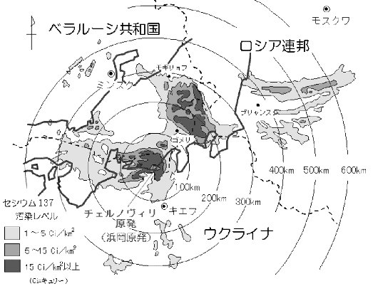 したものほど長い間とどまる。セシウム-137の半減期は30年で、何十年も減衰せず、高濃度汚染地域は居住不能になる。図で濃く着色された15キュリー/1ku(56ベクレル/1cu)以上の汚染地域は、立退き対象地域である。日本地図と重ねると、静岡だけでなく、風向きと雨により、やや離れた東京・神奈川・埼玉・群馬・栃木あたりが立退き地域になっている。