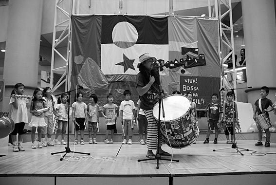 ● 小学生の頃は「世界の民謡」って本があって、そんな歌よく歌ってた。中学生の時にBeatlesを聞いたのが衝撃的で、ギターを買って弾きながら歌うようになって…それで23歳の時にものすごいギタリストに出会ってね。ブラジルや南米の音楽を聴くようになったのはその人の影響。本格的にバンドをやりだしたのは八戸にきてから…そういう意味で僕はいろんなことに呼ばれてこの地へ来たって感じもするんです。まず八戸でサンバ・チームを作ったのがけっこうセンセーショナルで、30人位いて市や県のイヴェントに参加したり、危うく原燃提供のTV番組にまで引っ張りだされそうになったり。今は2人組のユニット、例の長い名前の<ポップ・マシン>と、即興爆音バンドの<魔太郎定食>をやっています。メンバーは他に仕事があって、僕も他のイヴェントで忙しいけど…9月からけっこうライヴをやっていく予定です。