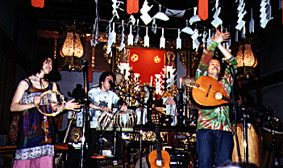| 4月29日に千葉県市川市のお寺の本堂で開かれた虹の祭りオープンフォーラムで演奏する岡野弘樹と天空オーケストラ |
