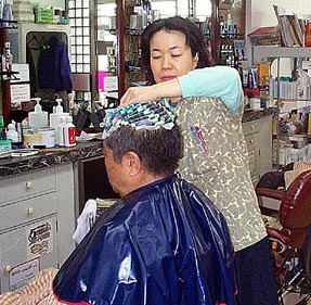 名古屋静枝さんのお店、B/B(バーバー)ニューナゴヤは東京の目黒区祐天寺の駅からすぐの所にある。4〜5人のお客さんが入れるような、どこにでもあるようなつくりの理容院だ。しかし店内に入ると、様々なヘアケア用品が並んでおり、また髪の毛の写真と解説などが壁に貼られていて、ちょっと雰囲気が違う。