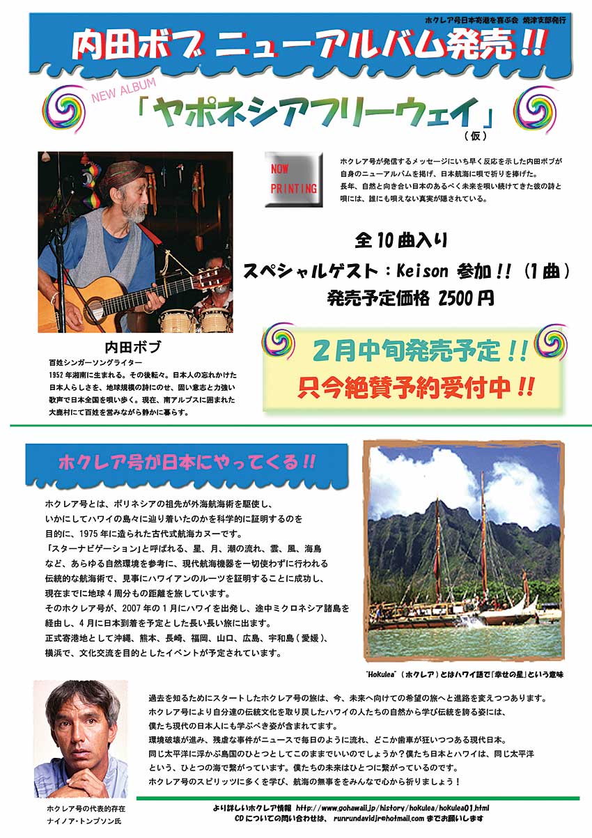 ホクレア来航に向け、ヤポネシアの魂の復活を祈り、太平洋の平和を願うボブのCDを制作中です。アキノイサムさんがジャケット用にホクレアと祝島のスナメリクジラを描いてくれ、内田正洋さんがライナーノーツを、 KEISONやキャデラックの米森マサキ他、第五福龍丸の故郷、静岡の仲間たちが参加協力して創りあげた渾身の歌の数々です!