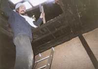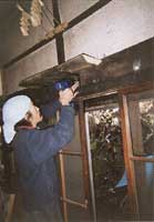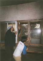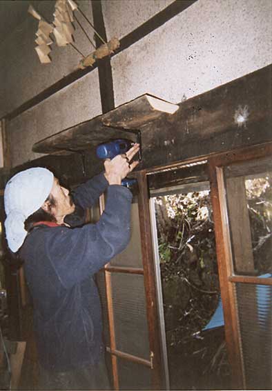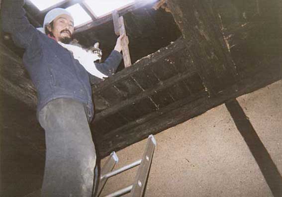 廃屋再建。天井に天窓を作る作業中。ネコのミユと共に。