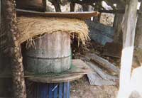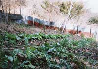 我が家で飼っている野性の日本ミツバチの巣の入った樽。この春、分蜂が楽しみだ。緑のネットはスズメバチよけ。