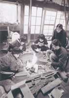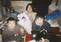 右=長男の天地、左=次男の八星、中央=史江と一新(お産のまぎわに完成したこの寝室で出産した)