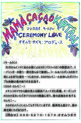 チャクララは女性3人、男性2人のチームで、そこへ4410のヒロ君と僕が加わり、計7人で、7つのチャクラがそろった七福神(人)だなんて盛り上がって、極寒波の中、皆のとても暖かい愛に包まれてオリジナルなキールタンソングを心待ちにしていた彼らとあっという間に合体して、素晴らしい祈りの時を世界と共有できました。 そして翌日、重ね岩という別の遺跡をお浄めし、その後、そのすぐ下にある吾郎庵というスペースで、さっそく現象界への繁栄としてキールタンのライブを皆でして、とても良い流れとなりました。 さらに、そこの吾郎さんという人は、メキシコのマヤから直接に現地の人と顔の見える関係で、カカオの生豆を輸入、販売している人で、本来のカカオの良さを伝えるワークショップを各地で展開している人です。キールタンを聞いて、これはカカオのセレモニーにぴったりだということで、ここでマヤカカオとつながります。ちIなみに市販のココアやチョコレートに使っているカカオは、口溶けの良い部分だけを抽出して作っているので、カカオ本来の栄養やエッセンスがあまり入っていません。血流をよくし、若返りの秘薬の要素もあり、カルシウム、マグネシウムなどのミネラルも多く、まさにメディスンです。 現地ではママカカオと呼ばれ、シャーマンに大地の精霊としてあがめられているものであり、愛のチャクラを開く力を持っていると僕も確かに感じています。 僕は意味あって特別な波動のものと出会う時には、事前に波動だけが届くという経験を今までにも何度かしています。クリスタルやアヤワスカと出会った時もそうでしたが、今回は何かとてもチアフルな喜びの波動が小豆島へ渡る前からずっと届いていました。結論から言えばママ・カカオの愛の波動だったのですが、冬至のすぐ後、1月の9日に吾郎さんが何と津志嶽のふもとでカカオのワークショップをするということになっていて、これはすでにセッティングされているオートマジックな流れと感じ、さっそくキールタンの歌で参加することとなりました。吾郎さんとしても初めてセレモニーらしき事ができると喜んでくれて、前日から我が家へ泊まり、ギターを弾く人なので練習して共にキールタンをしました。 実は以前にママカカオへの祈りの歌が生まれていて、こちらもスタンバイOKでした。初めて本来のカカオをいただき、かなりの高揚感を得たのですが、事前に届いていた波動のレベルには達していませんでした。後日、その波動の源からメッセージを受け、生豆を食べなさい。という事でしたので、通常は皆焙煎したものをいただくのですが、手元に生豆がありましたから焙煎していただくつもりでしたが、一粒の半分かじってみました。そうしたら間も無く開いてしまい、本来の波動に届く事ができました。 旧約聖書に神への捧げ物に対する教えがあり、発酵して焼いたパンをささげてはいけないということになっています。 チャパティのように発酵させずに焼いたものは良しとされています。発酵したパン種を焼くと、酵素は全部死にますから、その辺に理由があるのかなと想像しますが、やはり酵素を生きたままお腹に入れて共生する方が栄養価も高く、カカオとの共生感も高まると感じています。正直言って自家製パンを焼く時には、いつも発酵菌に対して心痛む思いがありました。 何が起こったかというと、カカオと共生している酵素が生きたままお腹にはいり、眠っていた酵素が目覚めて増殖をはじめます。その酵素の精霊の喜びの波動がママカカオの精霊の波動とつなげてくれたのだと解釈しています。その後、ハルモニウムもキールタンもどんどん進化して、さらなる歌うたが生まれ続けている状態です。 長くなりましたが、そんな流れの中にあって、今はソロ活動的にはママカカオ・キールタンと題して、カカオセレモニーとキールタンの歌の合体で愛の波動を広げる依代となる動きとなります。そして息子の一新(今春高校卒業)らと共にやっているロックバンド BIG FAMILYと合わせて、今年は現象界に反映しまくるつもりでいます。皆さんよろしく。