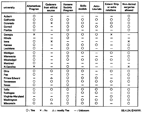 alternative実習の施行としては、学部の必修科目から動物の犠牲を伴う実験やトレーニングを完全に排除した例(オランダ・フィンランドの大学のすべての医学部、イギリスの全獣医大学など)もあるが、最も多い例としては、生徒個人が動物の犠牲を伴う実習に直面した場合、代替法を要望し選択していくものである。アメリカの獣医大学27校の内、正式なalternative
