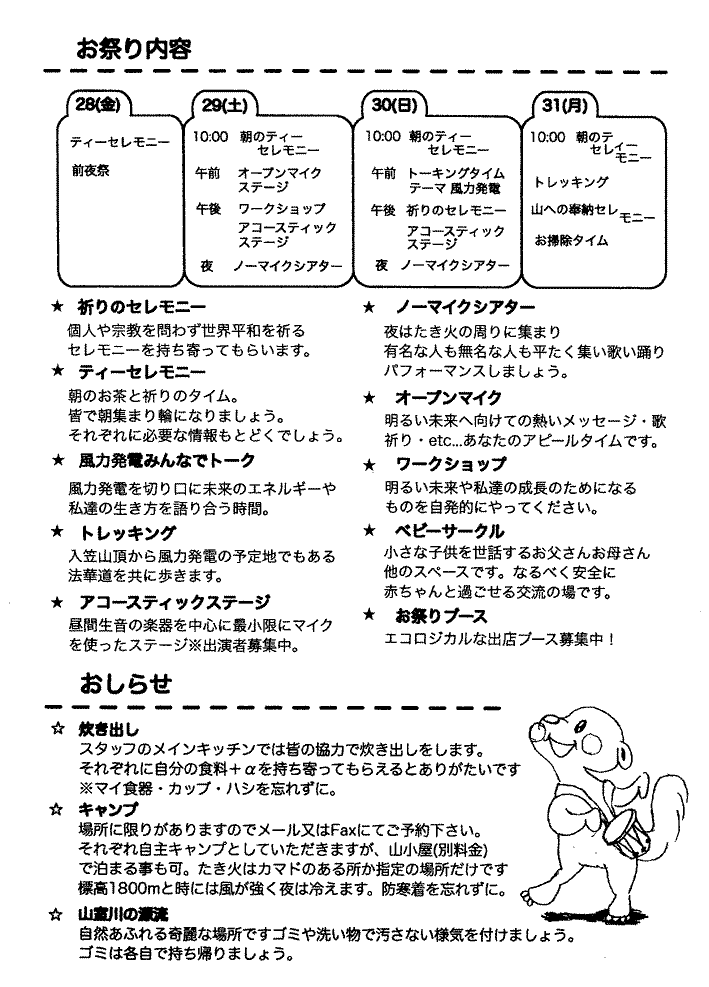 ★駐車場・キャンプ場にはスペースに限りがありますので、下記へ予約ください。 連絡先:tel/fax. 0265−94−3385(大村) E-mail;shiroi_anaguma@yahoo.co.jp http://heartland.geocities.jp/shiroi_anaguma *上の写真は入笠山で撮られた白いタヌキ → 大村和生のシピラ通信 No.6 *下の写真は会場となるキャンプ場。すぐ目の前に入笠山山頂がのぞめる(クリックで拡大) 地元の観光案内サイト 個人の入笠山情報サイト 写真レポートページ