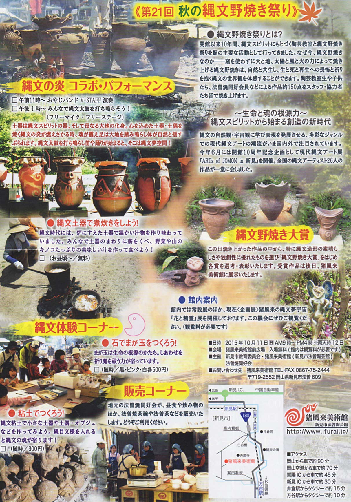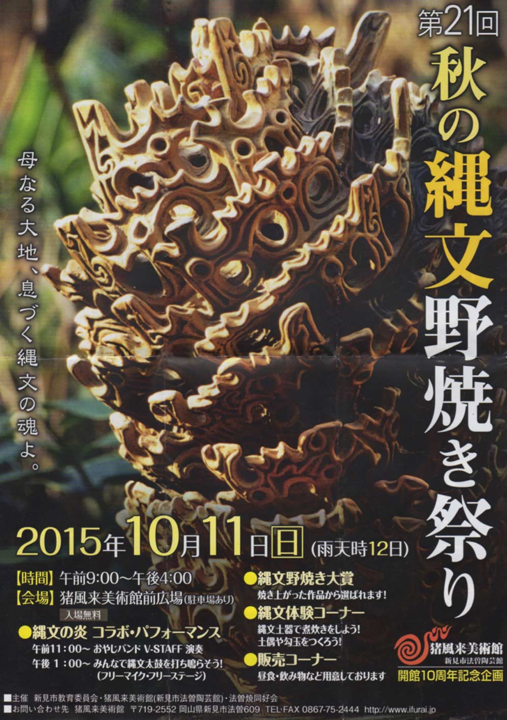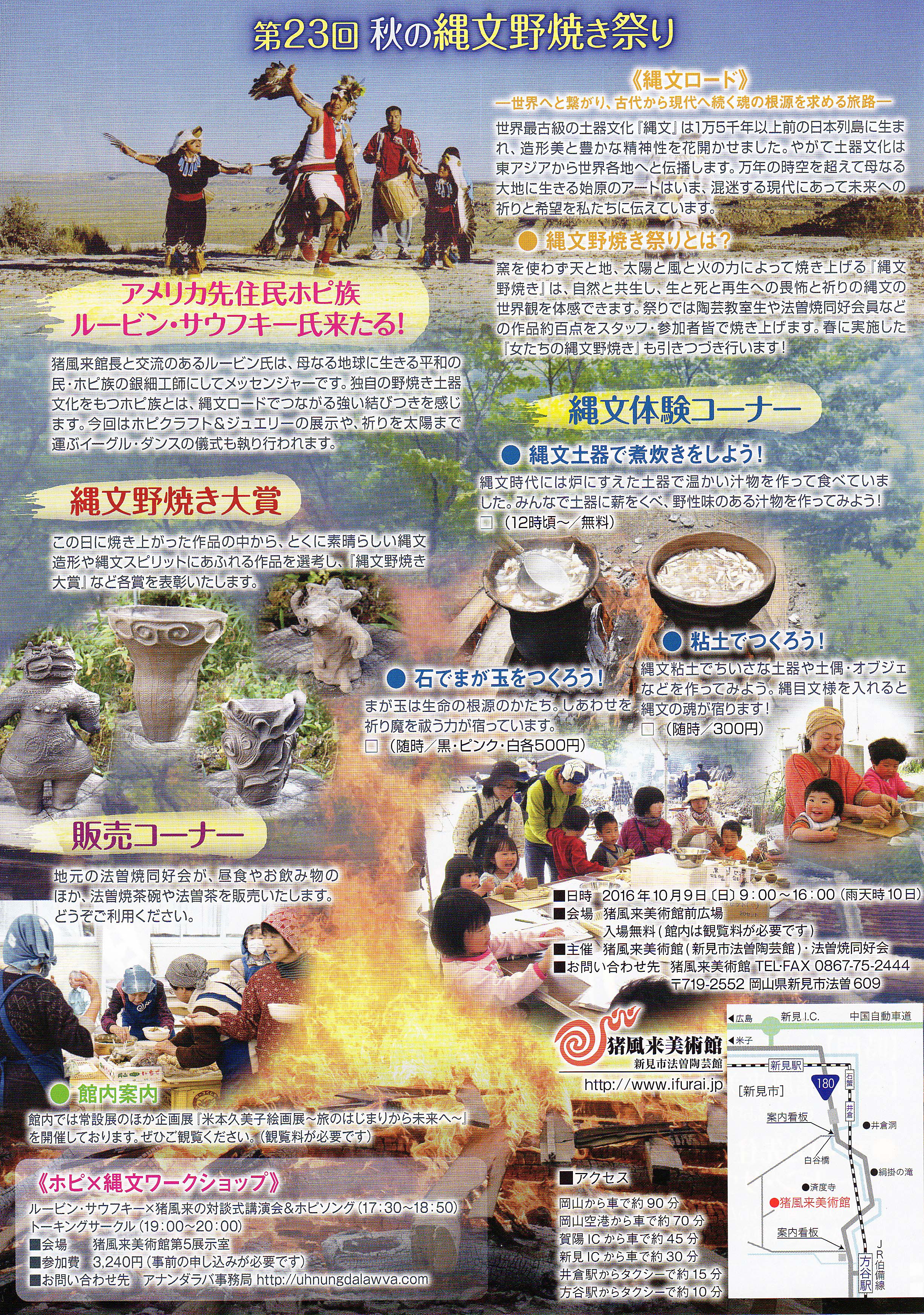 ★火祭の最終イヴの日、10月11日(日)は、猪風来(いふうらい)美術館の廃校の校庭で縄文野焼き祝典祭りがあり、そこで、火祭即興のクライマックスが起きれば!!と強く妄想してます。チラシ表/裏面
