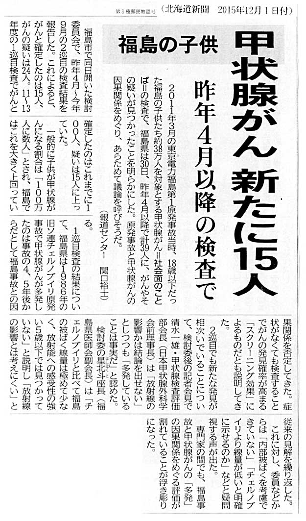 ところが、日本甲状腺学会・理事長だった山下俊一は、ヨウ素剤を配布させなかったばかりか、甲状腺学会の医師会宛に「二次検査(セカンド・オピニオン)をしないように」という趣旨の要請書を送っていた。その山下俊一が取り仕切っていたのが、福島県立医科大学である。そして福島県では、この大学が「我が国で初めて」の大規模な県民健康調査を実施してきた。その結果を「甲状腺検査評価部会」が最終判定して、甲状腺ガンが数十倍に増加していると認めていながら、「これは福島原発事故とは無関係だ」と言い張ってきた。「今までより精密に、全員を検査するようになったから、ガンの発見件数が増えただけだ」と言い訳している。ならば全国でも、これと同じ70倍以上の比率で大量の子どもの甲状腺ガンが発生しているのか? だとすれば、それは日本の国家として一大事であるから、すぐにでも全国の子どもの検診をしなければならない。なぜ全児童の検査をせずに、非科学的な言い訳を続けるのか。
