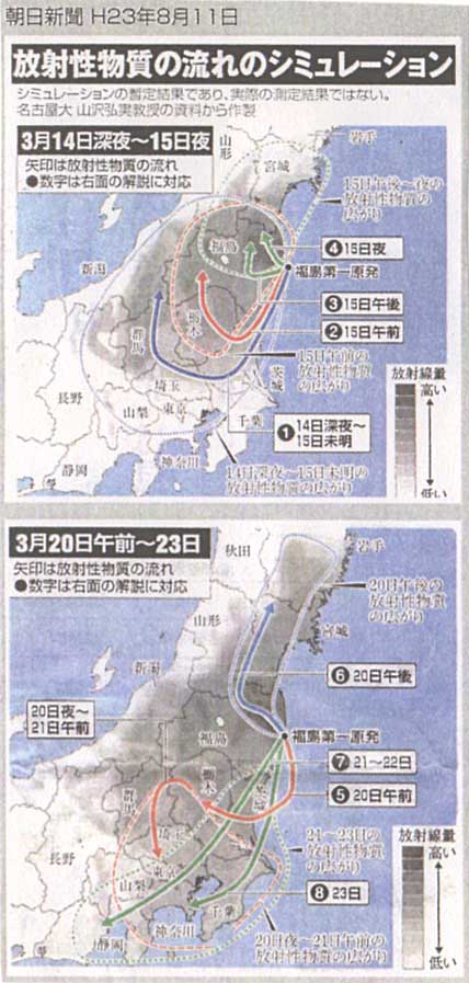 福島から首都圏の千葉、東京に至るまでの太平洋側は、途中に全く山がないため、4月から5月になっても南下した高濃度の放射能雲が直撃し続けた。自治体施設の測定値に基づいて文部科学省が2011年11月25日に公表した値では、3〜6月(ほぼ3カ月半)の放射性セシウムの月間降下物の総量は、繁華街・新宿が岩手県盛岡市の6倍に達した。