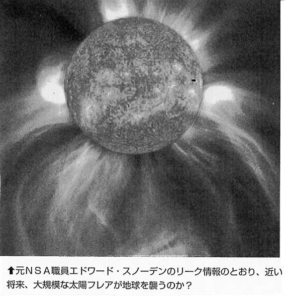 2013年に、米国国防総省のNSA(国家安全保障局)による、全地球的規模の通信傍受システム“エシュロン”の実態を暴露し、現在は亡命してロシアにいる(らしい)元職員、エドワード・スノーデンは、太陽フレアに関する情報もリークしている。遠くない将来に太陽では大きな異変が発生し、大規模な太陽フレアが地球を襲う可能性が高いというのだ。