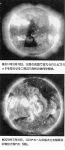 2011年3月12日、折しも日本で東日本大震災が起きた翌日、太陽の表面に巨大なピラミッド図形が浮かび上がった。コロナの中に浮かび上がった幾何学模様は二等辺三角形で、不気味なのは、緯度、経度とも0度地点に出現したこと。そして、この模様が巨大な穴―暗黒空間として現出したという事実だ。NASAは、太陽表面の磁場によってコロナに開いた穴が偶然にも二等辺三角形のピラミッドに見えたものだ、とコメントしている。