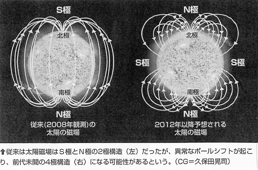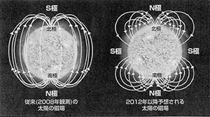 2012年4月19日、国立天文台や理化学研究所、JAXA(宇宙航空研究開発機構)の連名による驚くべき発表があった。従来、太陽の磁場は北極がS極、南極がN極だったが、国立天文台の太陽観測衛星「ひので」によると、この磁場の反転が進んでいるというのだ。それも単にS極とN極が入れ替わるのではない。北極と南極を縦にN極とN極が結び、S極とS極が太陽を横に相対する「4極構造」に、今後変化していくというのである。