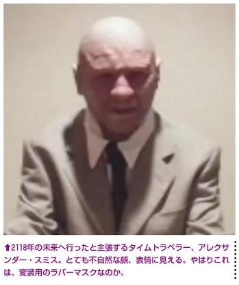「Time Traveler Who Has Been To The Year 2118 Speaks Out(2118年にタイムトラベルした人が語る)」という動画が、ApexTVで2017年11月16日に公開された。動画では元CIAのアレクサンダー・スミスと名乗る人物が、2118年に行ったと主張している。彼は変装用のラバーマスクを被っていて、素顔を明らかにしていない。また、インタビューはスカイプによるものだったという。つまり、スミスと直接会った者はいない。ネット上であっても素顔を明かしたくないということである。そうなれば、名前も当然、偽名である可能性が高い。
