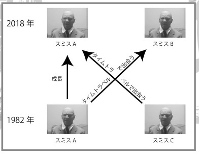 動画「あのタイムトラベラーが1982年から来た自分自身に出会う」では、スミスはタイムパラドックスについて語っている。実は彼(スミスA)は1982年に、2018年という未来へ行き、未来の自分(スミスB)に会っていたというのである。一方で、スミスAの今の自分=、今度は過去の自分(スミスC)が会いに来た。二人の自分が出会ってしまった以上、もし、過去の自分が会いに来なかったら、タイムパラドックスが起こる。ところが今回、彼らは動画を撮った。実は過去のスミスAが未来のスミスBに会いに行った時、動画は撮っていないのだ。もしイゴール・ノヴィコフが言うように、「我々はパラドックスが起きないように行動することを余儀なくされる」のだとしたら、この映像も見えない力に妨げられ、録画も配信も不可能だったはずなのだ。