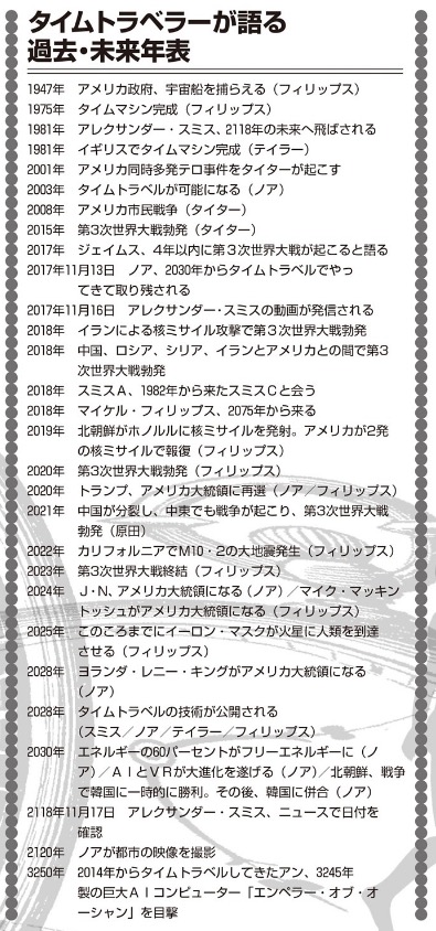 今、インターネット上で次々と名乗りをあげる「タイムトラベラー」たちがいる。人類に警告を与えるとして、第3次世界大戦を含む近未来の出来事を語り続ける彼ら。そのタイムトラベラーたちが目撃した未来とは何なのか。そもそも一般の科学常識では考えられないタイムトラベルというものが可能なのか。「タイムトラベラー」たちの出現は、2017年から加速度的に増えている。これは、タイムマシンの公開がいよいよ近くなってきたことと、我々の世界線は元より、それに近い全てのパラレルワールドの世界線において、タイムトラベラーたちが警告したくなるような悲惨な近未来が待ち受けている証拠なのかもしれない。