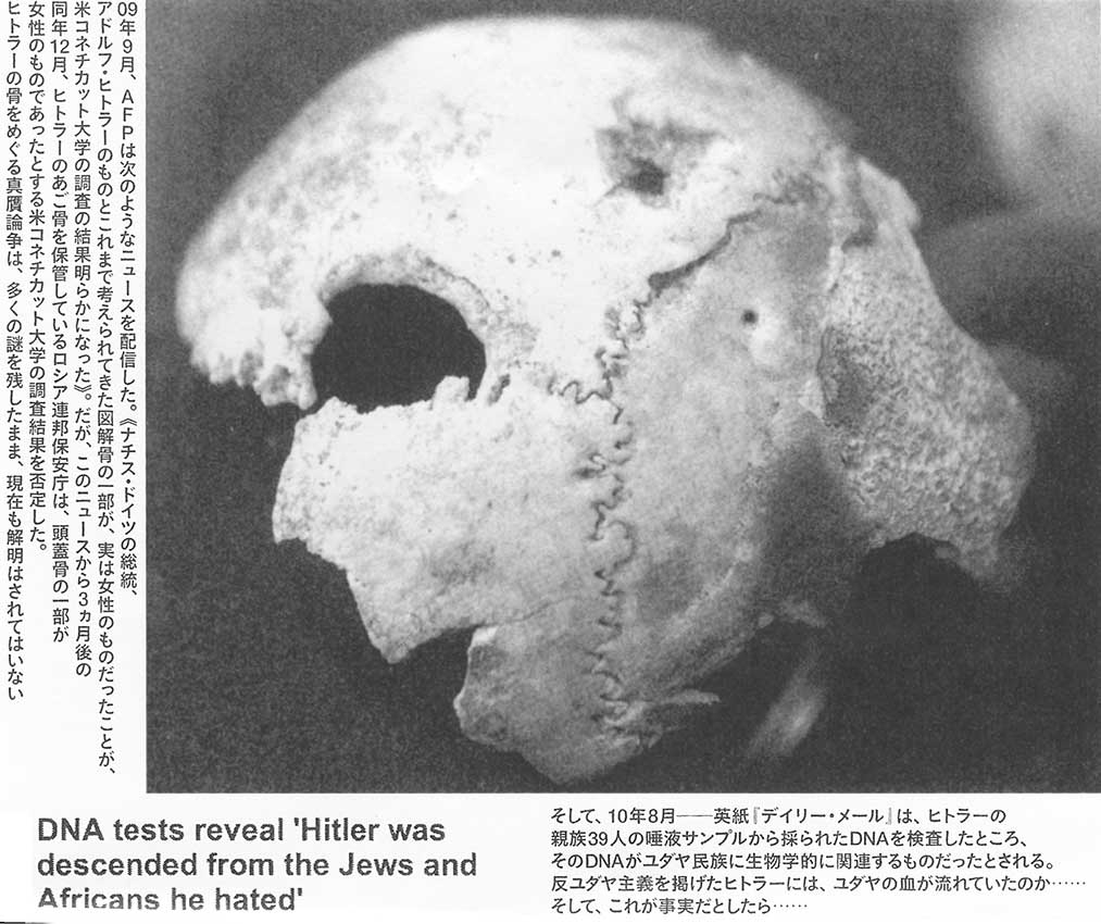 1945年4月30日、ドイツ・ベルリンの総統府地下室に愛人のエヴァ・ブラウンと共に籠もったヒトラーは、自ら頭に銃口を向け、命を絶った。これが世界史の「常識」とされるヒトラーの最後だ。ところが―2009年9月29日、その「常識」が覆るという、とんでもないニュースがAFPから世界に発信された。これまでヒトラーの遺骸とされてきた頭蓋骨のサンプルをDNA分析にかけたところ、20〜40歳代の女性のものであることが判明したというのである。