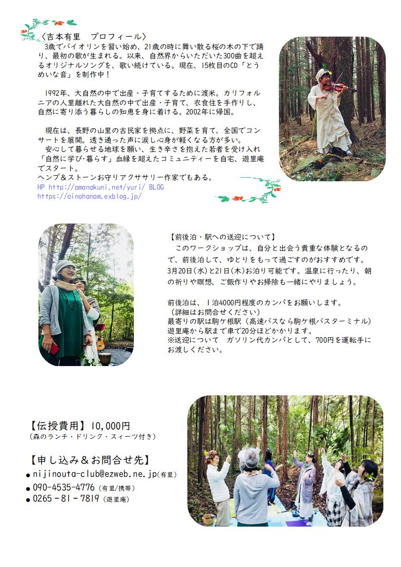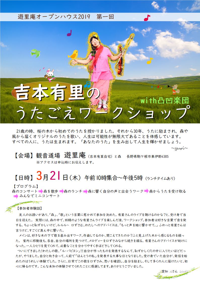 | 3月21日(木) | 長野 | 長野県 駒ケ根市 遊里庵(有里自宅) →チラシ表 チラシ裏 吉本有里のうたごえワークショップ (森に入って、一人ひとりオリジナルソングを作れるようにガイドします) ■会場 駒ケ根市東伊那4385 観音道場 遊里庵 ■時間 10時~17時(ランチタイムあり) ■料金 10,000円(森のランチ・ドリンク・スイーツ付き) ■お申込み&お問合せ nijinouta-club@ezweb.ne.jp / 090-4535-4776 (有里) 0265-81-7819(遊里庵) |