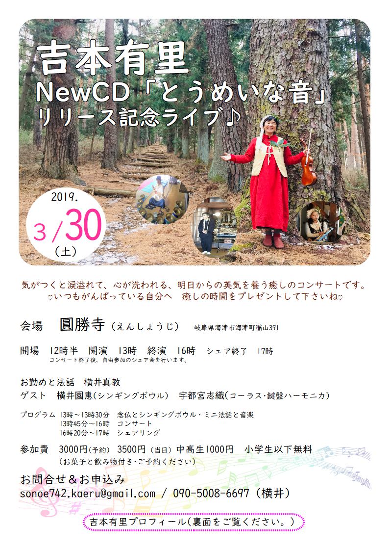 | 3月30日(土) | 岐阜 | 岐阜県海津市 圓勝寺 →チラシ 吉本有里 NewCD「とうめいな音」リリース記念コンサート ■会場 圓勝寺 海津市海津町稲山391 ■時間 開場 12時半 開演 13時 プログラム 13時~13時30分 念仏とシンギングボウル・ミニ法話と音楽 13時45分~16時 コンサート 16時20分~17時 シェアリング ■料金 3000円(予約)3500円(当日)中高生1000円 小学生以下無料 ■お申込み&お問合せ sonoe742.kaeru@gmail.com / 090-5008-6697(横井) |