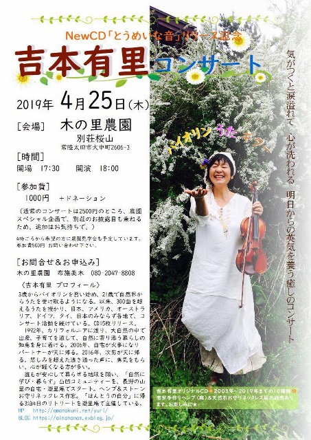 | 4月27日(土) | 東京 | 東京都青梅市 吉本有里コンサートNewCD「とうめいな音」リリース記念 ■会場 ひだまりの郷 東京都青梅市成木2-467 ■時間 午後から ■お申込み&お問合せ blueberry-jam.2525.k@docomo.ne.jp(清水敬子) sakanachan-nori46@ezweb.ne.jp(徳子さん) |