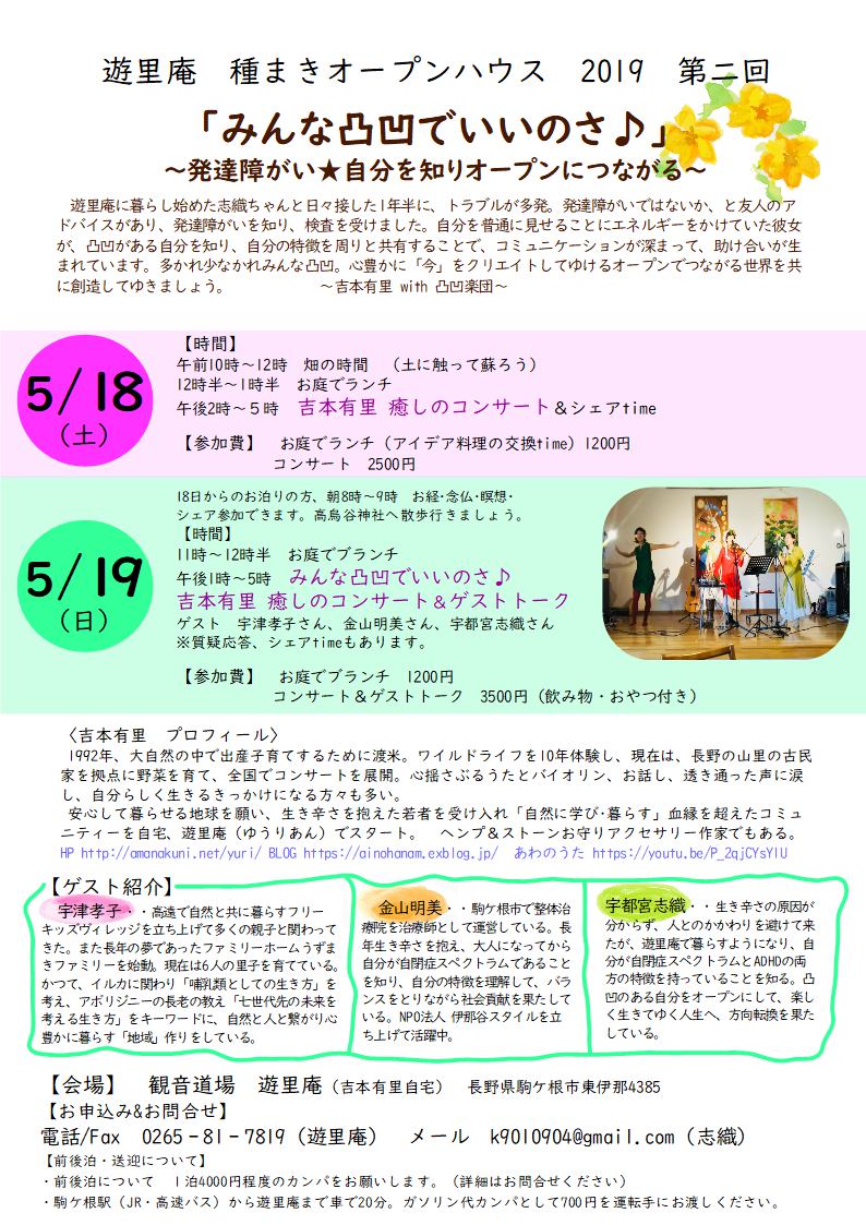 | 5月19日(日) | 長野 | 長野県駒ケ根市 →チラシ 遊里庵オープンハウス 2日目 みんな凸凹でいいのさ ■会場 駒ケ根市東伊那4385 観音道場 遊里庵 ■時間 お庭でブランチ 11時~ 吉本有里コンサート&ゲストトーク 13時~17時 ゲスト 宇津孝子さん、金山明美さん、宇都宮志織さん ■料金 ブランチ 1200円 コンサート&ゲストトーク 3500円(飲み物・おやつ付き) ■お申込み&お問合せ 0265‐81‐7819(遊里庵) k9010904@gmail.com (志織) |