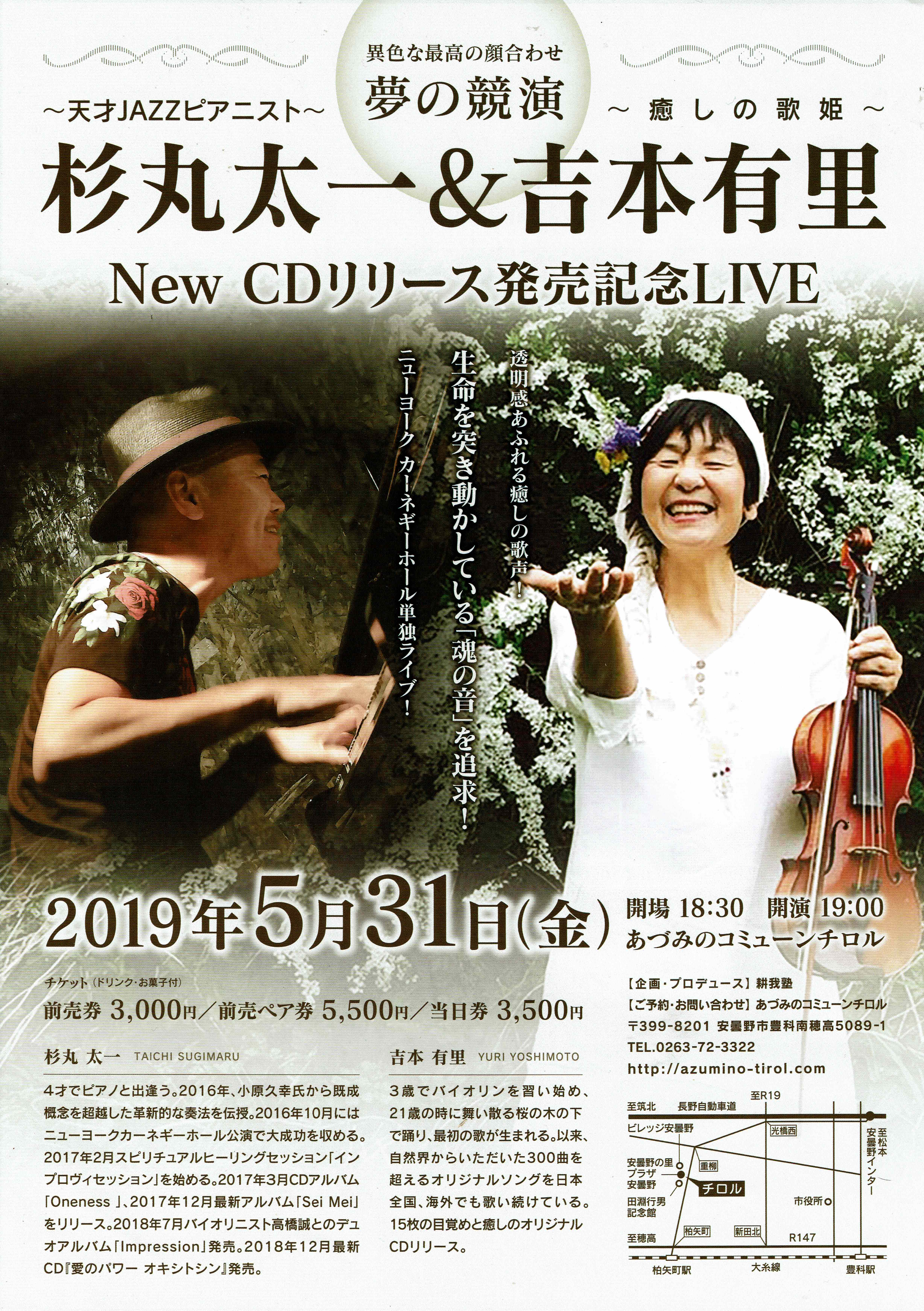 | 5月31日(金) | 長野 | 長野県安曇野市 ▶チラシ NewCD「とうめいな音」リリース記念 吉本有里&杉丸太一(ピアノ)コンサート ■会場 あずみのコミューンチロル 安曇野市豊科南穂高5089-1 ■料金 前売り3000円、前売りペア5500円、当日券3500円 ■お申込み&お問合せ 0263-72-3322(チロル) |