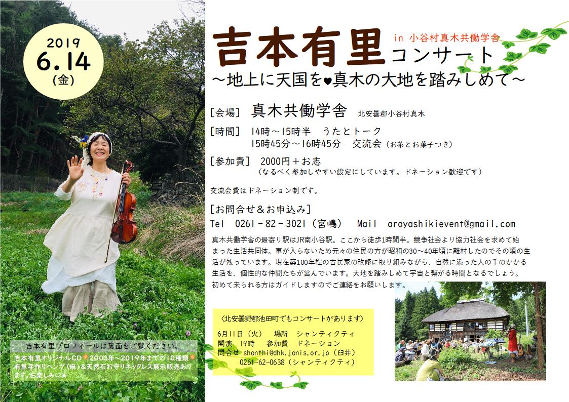 | 6月14日(金) | 長野 | 真木共働学舎 ▶チラシ 吉本有里コンサート ~地上に天国を♥真木の大地を踏みしめて~ ■会場 真木共働学舎 北安曇野郡小谷村真木 ■時間 14時~15時半 うたとトーク 15時45分~16時45分 交流会(お茶とお菓子つき) ■料金 2000円+お志(なるべく参加しやすい設定にしています。ドネーション歓迎です。) 交流会費はドネーション制です。 ■お申込み&お問合せ 0261-82-3021(宮嶋)Mail: arayashikievent@gmail.com |