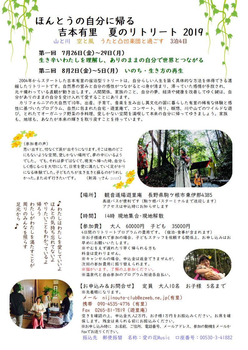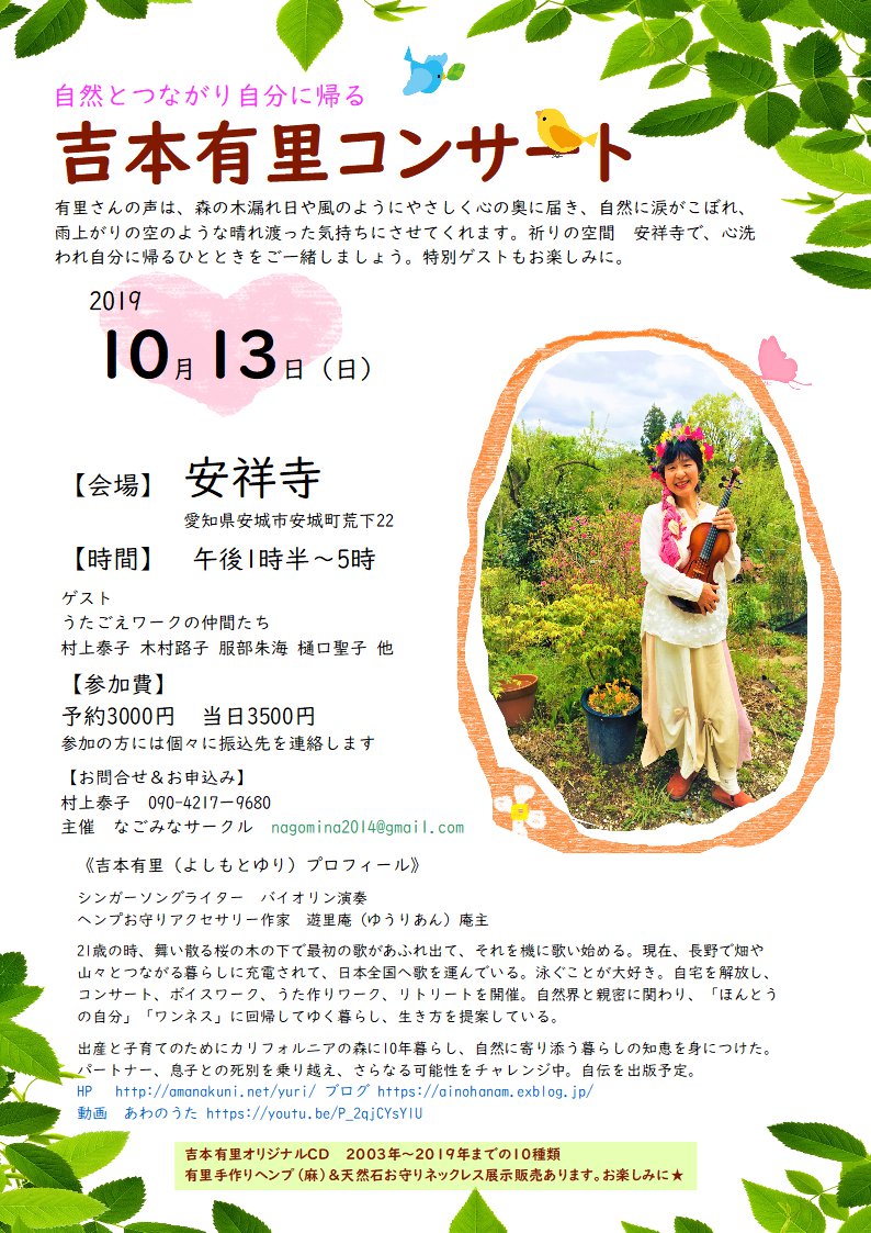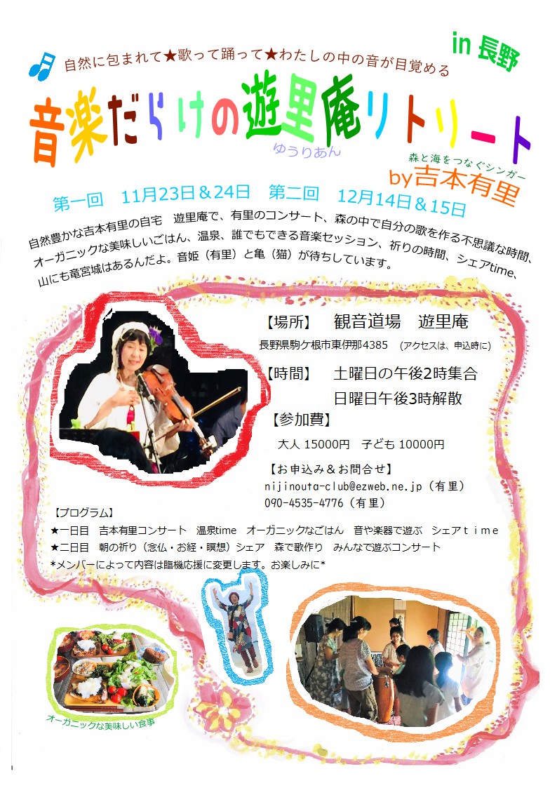 →チラシ 音楽だらけ遊里庵リトリートby吉本有里 場所 遊里庵 長野県駒ケ根市東伊那4385 (アクセスは、申込時に) 時間 土曜日の午後2時集合 日曜日午後3時解散 プログラム (初日)吉本有里コンサート 温泉time オーガニックなごはん 音や楽器で遊ぶ シェアtime (二日目) 朝の祈り(念仏・お経・瞑想)シェア 森で歌作り みんなで遊ぶコンサート ※ メンバーによって内容は臨機応援に変更します。お楽しみに。 参加費 大人15000円 子ども10000円 お申込み&お問い合わせ nijinouta-club★ezweb.ne.jp ※★を@に変えてね(有里) 090-4535-4776(有里) |