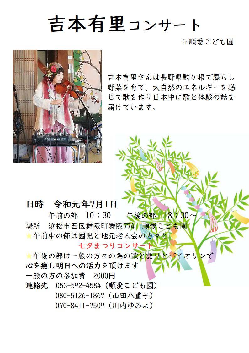 →チラシ 日時 7月1日 午前の部 10:30 午後の部 18:30~ 場所 浜松市西区舞阪町舞阪774 順愛こども園 ★午前中の部は園児と地元老人会の方々へ 七夕まつりコンサート ★午後の部は一般の方へ 参加費(午後の部) 2000円 連絡先 053-592-4584(順愛こども園) 080-5126-1867(山田八重子) 090-8411-9509(川内ゆみよ |