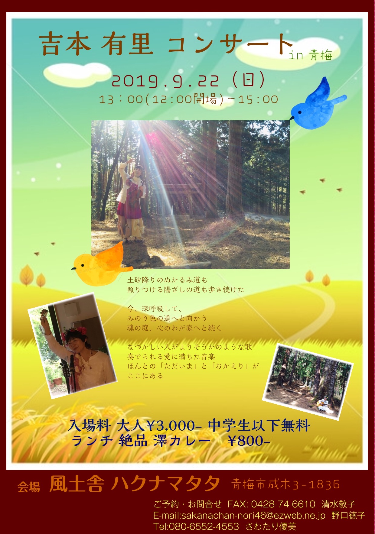 →チラシ 裏面 ■場所 風土舎 ハクナマタタ 東京都青梅市成木3-1836 ■時間 12時開場 13時開演 15時終演 ■料金 大人3000円 中学生以下 無料 ランチ 絶品 澤カレー 800円 ■お申込み&お問合せ Fax 0428-74-6610(清水 敬子) E-mail sakanachan-nori46★ezweb.ne.jp(野口 徳子) ★→@ Tel 080-6552-4553(さわたり 優美) |