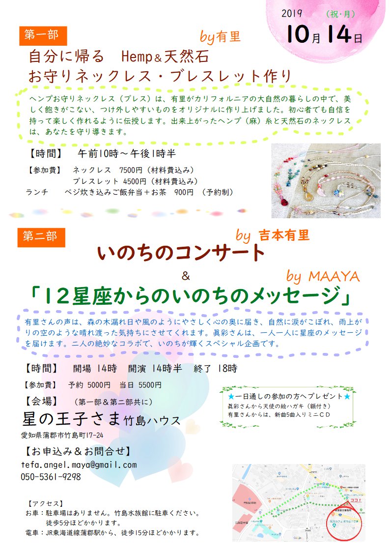 →プロフィール 第一部 自分に帰るおまもりhemp&天然石ネックレス・ブレスレット作りby有里 時間 午前10時~午後1時半 参加費 ネックレス 7500円 ブレスレット 4500円(材料費込み) ランチ ベジ炊き込みご飯弁当+お茶 900円 (予約制) 第二部 いのちのコンサートby吉本有里₊+「12星座からのいのちのメッセージ」by眞彩 時間 午後2時開場 午後2時半開演 6時 終了 料金 予約 5000円 当日 5500円 *通し参加の方はプレゼント有り 会場 (第一部&2部共に)星の王子さま竹島ハウス 愛知県蒲郡市竹島町17-24 お申込み(一部&二部共に) tefa.angel.maya@gmail.com 050-5361-9298 |