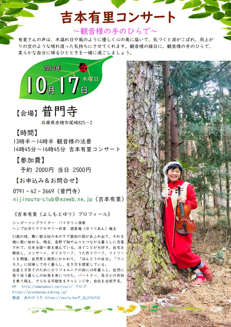 →チラシ 会場 普門寺 尾崎825-2 時間 13時30分~14時30分 観音様の法要 14時45分~16時45分 吉本有里コンサート 参加費 2000円(予約)2500円(当日) 申し込み先 0791‐42‐3669(普門寺) nijinouta-club@ezweb.ne.jp(吉本有里) |