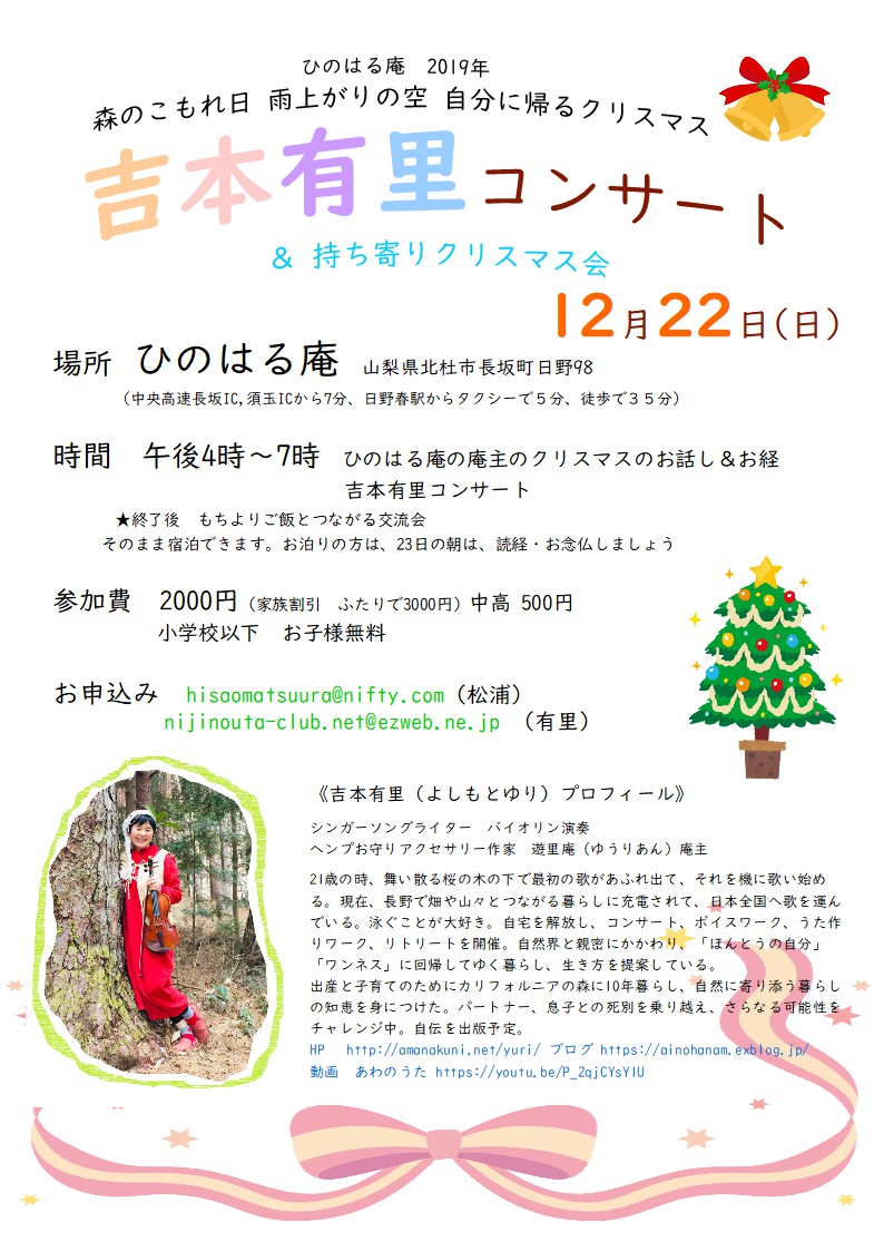 ひのはる庵 2019 森のこもれ日 雨上がりの空 自分に帰るクリスマス 吉本有里コンサート & 持ち寄りクリスマス会 →チラシ ■場所 ひのはる庵山梨県北杜市長坂町日野98 (中央高速長坂IC,須玉ICから7分、日野春駅からタクシーで5分、徒歩で35分) ■時間 午後4時~7時 ひのはる庵の庵主のクリスマスのお話し&お経 吉本有里コンサート ★終了後 もちよりご飯とつながる交流会 そのまま宿泊できます。 お泊りの方は、23日の朝は、読経・お念仏しましょう ■参加費 2000円(家族割引 ふたりで3000円)中高 500円 小学校以下 お子様無料 ■お申込み hisaomatsuura@nifty.com(松浦) nijinouta-club.net@ezweb.ne.jp (有里) |