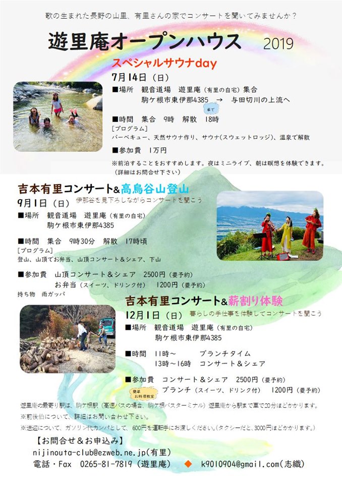 長野県駒ケ根市 遊里庵オープンハウス →チラシ 薪割り体験 &吉本有里コンサート ■場所 観音道場 遊里庵(有里の自宅)駒ケ根市東伊那4385 アクセスはお申し込み時に。高速バスが便利 ■時間 11時~ ブランチタイム 午後1時~4時 コンサート&シェア ■料金 ブランチ 1200円 コンサート&シェア 2500円 ■お申込み&お問合せ 電話/Fax 0265-81-7819(遊里庵) ◆ k9010904@gmail.com(志織) |