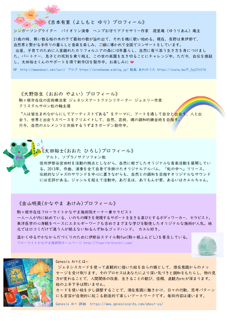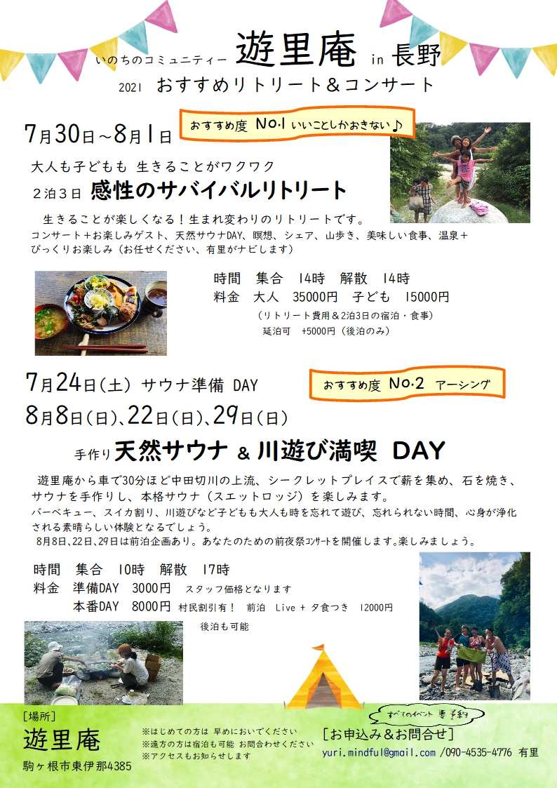 →チラシ 場所 遊里庵 駒ケ根市東伊那4385 時間 集合 10時 解散 17時 料金 8000円 村民割引有 前泊 Live+夕食つき 12000円(後泊も可能) お申込み&お問合せ yuri.mindful@gmail.com / 090-4535-4776 有里 |