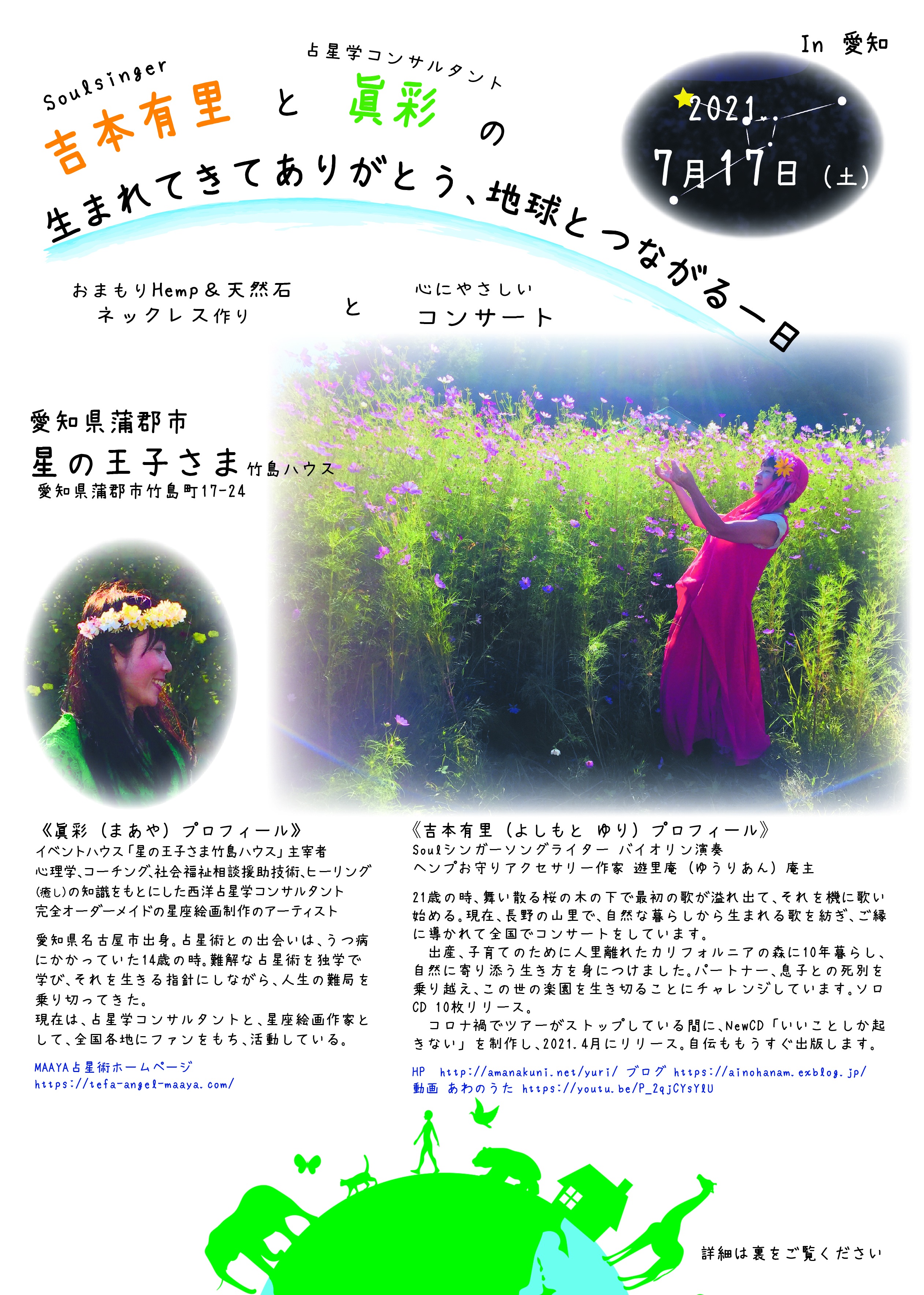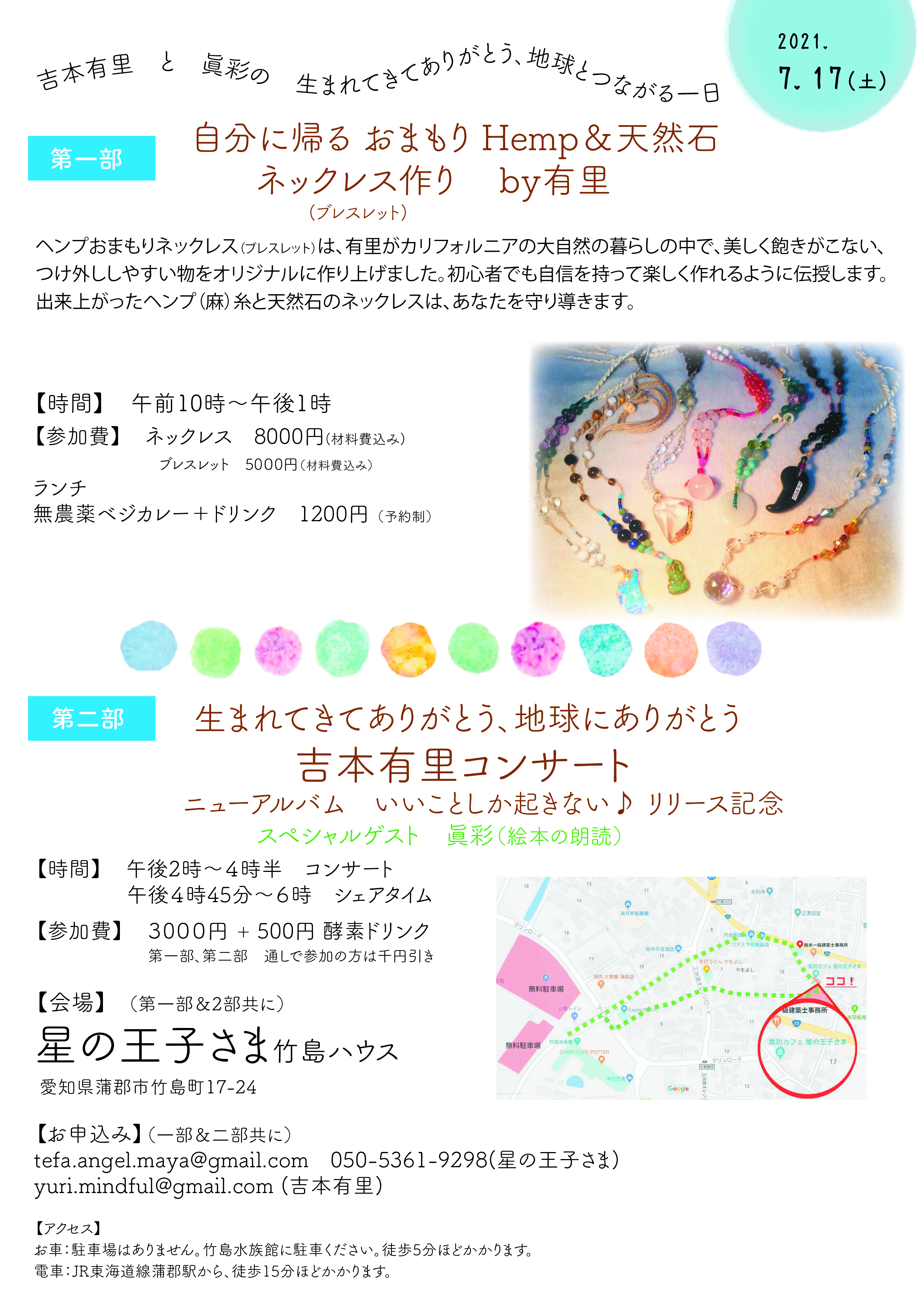 吉本有里と眞彩の 生まれてきてありがとう、地球とつながる1日 ⇨チラシ表 チラシ裏 場 星の王子さま竹島ハウス 愛知県蒲郡市竹島町17−2 時間 第一部 午前10時~午後1時 第二部 午後2時~4時半 コンサート 午後4時45分~6時 シェアタイム 参加費 第一部 ネックレス 8,000円(材料費込み) ブレスレット5000円(材料費込み) ランチ 無農薬ベジカレー+ドリンク 1200円(予約制) 第二部 3000円 + 500円 酵素ドリンク 第一部、第二部 通しで参加の方は千円引き お問合せ&お申込(一部&二部共に) tefa.angel.maya@gmail.com 050-5361-9298(星の王子さま) yuri.mindful@gmail.com (吉本有里) 【アクセス】 お車:駐車場はありません。竹島水族館に駐車ください。徒歩5分ほどかかります。 電車:JR東海道線蒲郡駅から、徒歩15分ほどかかります。 |