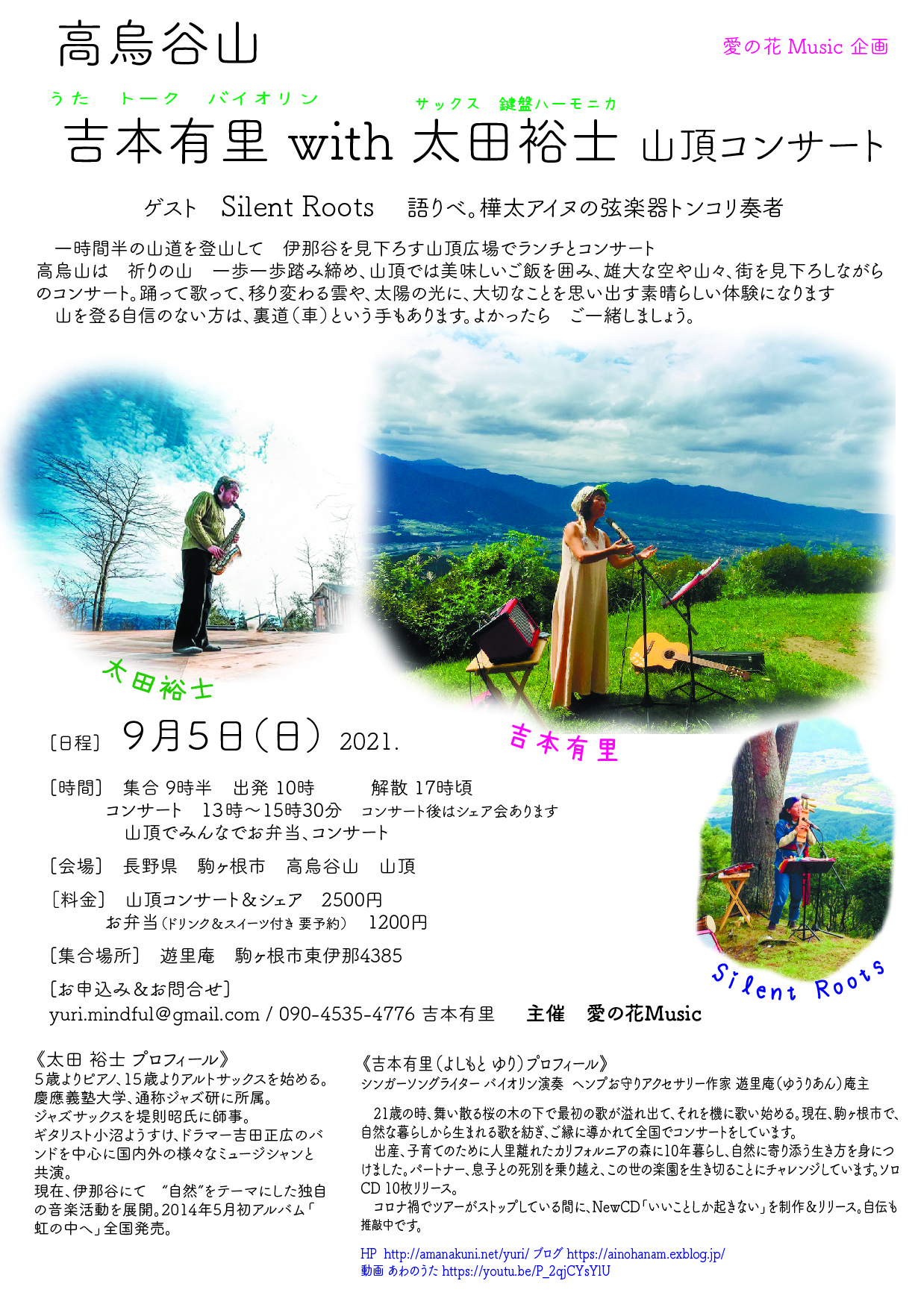 ゲスト:Silent Roots 樺太アイヌの弦楽器トンコリ奏者 →チラシ 会場 長野県 高鳥谷山 山頂 集合場所 遊里庵 駒ケ根市東伊那4385 時間 集合9時半 出発10時 解散17時頃 コンサート 13時〜15時30分 コンサート後はシェア会あります。 山頂でみんなでお弁当、コンサート 料金 山頂コンサート&シェア 2500円 お弁当(ドリンク&スイーツ付き 要予約) 1200円 お申込み&お問合せ yuri.mindful@gmail.com / 090-4535-4776 吉本有里 主催 愛の花Music |