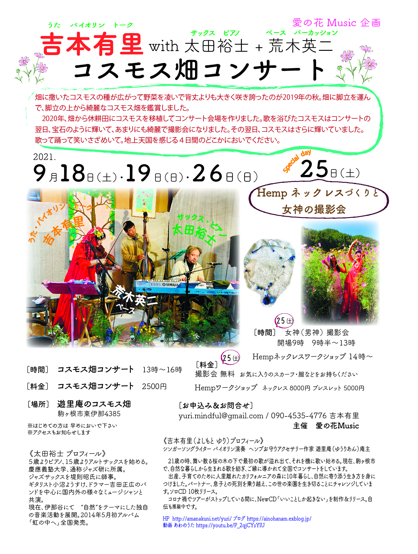 →チラシ 場所 遊里庵のコスモス畑 駒ケ根市東伊那4385 時間 13時~16時 料金 2500円 お申込み&お問合せ yuri.mindful@gmail.com / 090-4535-4776 吉本有里 主催 愛の花Music |