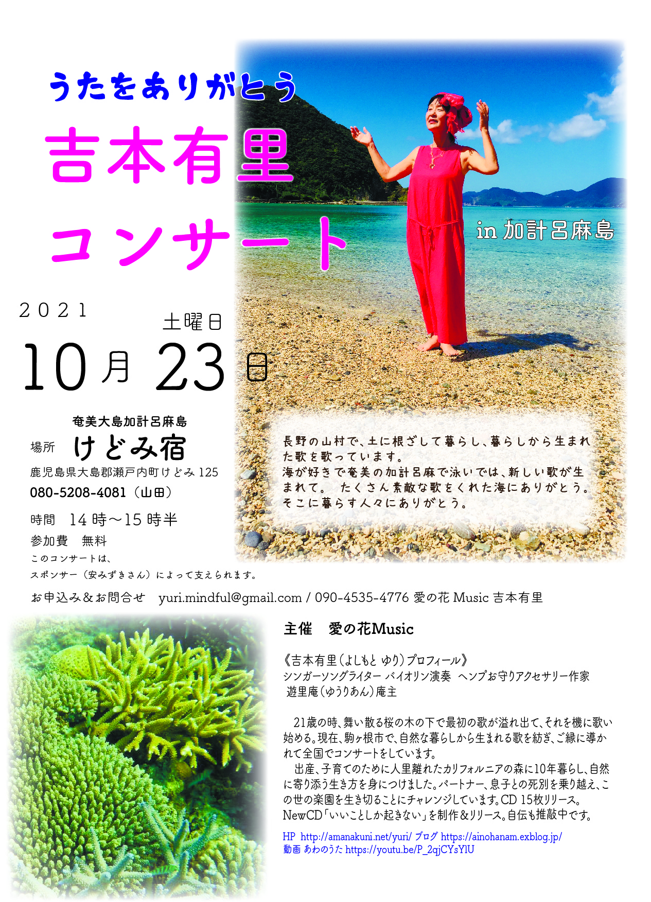 うたをありがとう吉本有里コンサートin加計呂麻島 →チラシ |