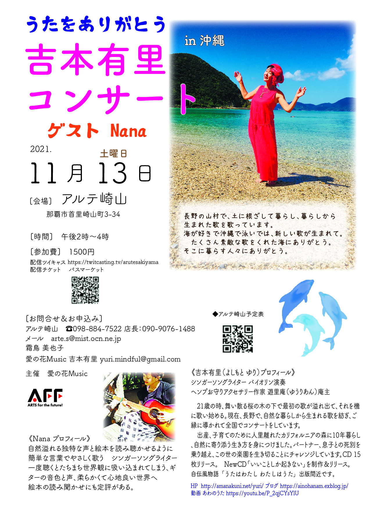 | 11月13日(土) | 沖縄 | うたをありがとう吉本有里コンサートin沖縄 ゲストNana →チラシ |