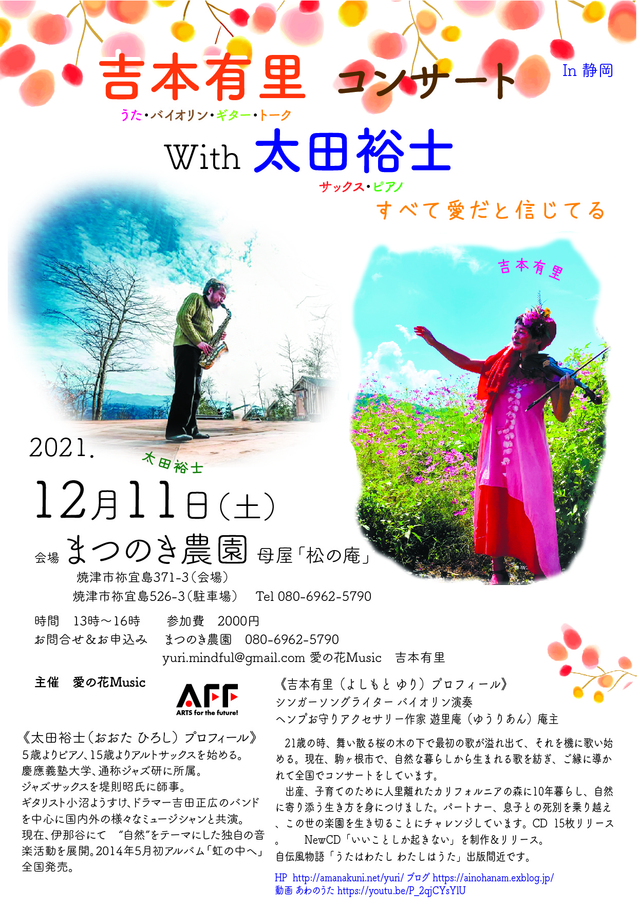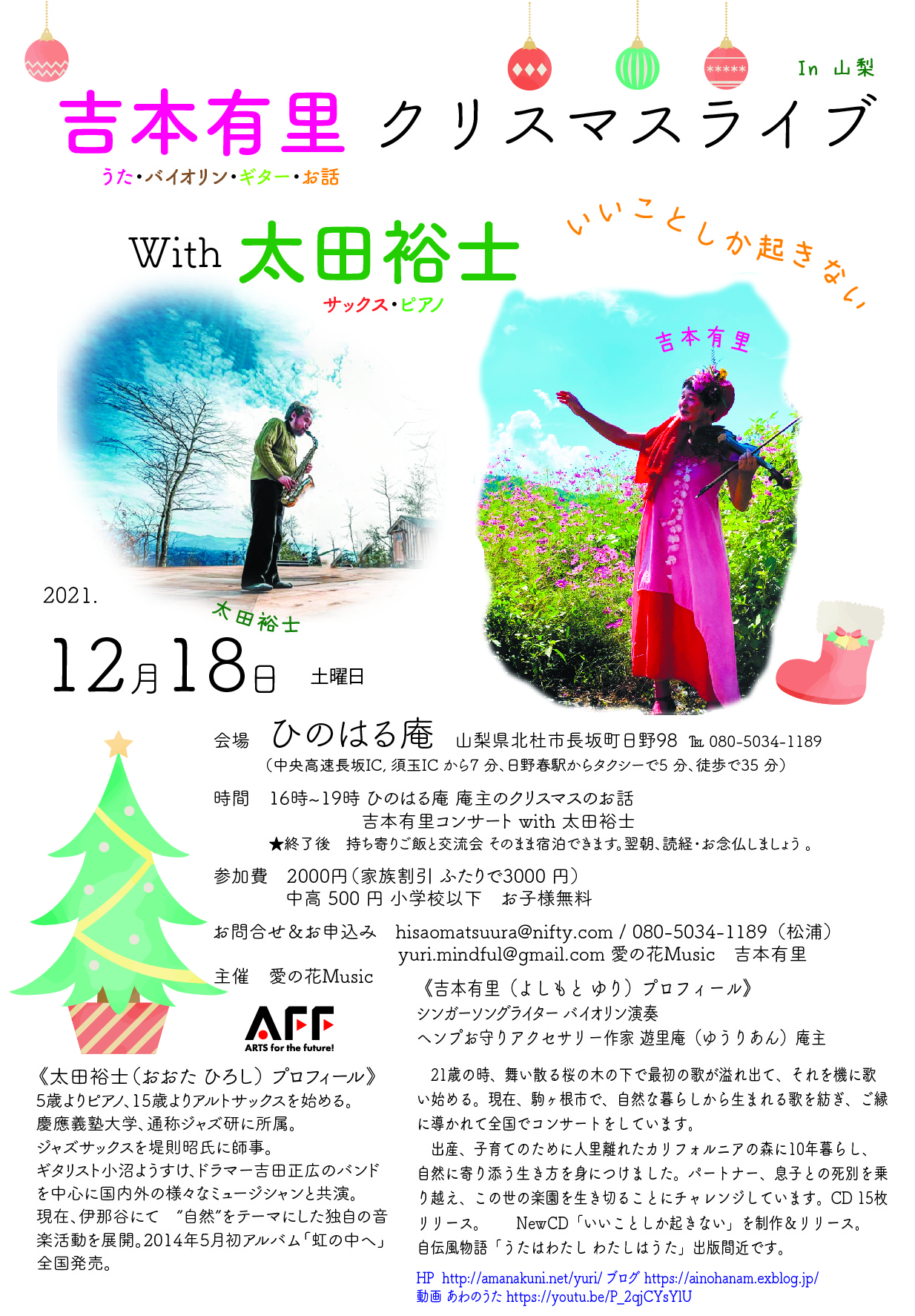 吉本有里クリスマスライブwith太田裕士 →チラシ 会場 ひのはる庵 山梨県北杜市長坂町日野98 時間 16時~19時 参加費 2000円 問合せ&お申し込み yuri.mindful@gmail.com 愛の花Music 吉本 主催 愛の花Music |
