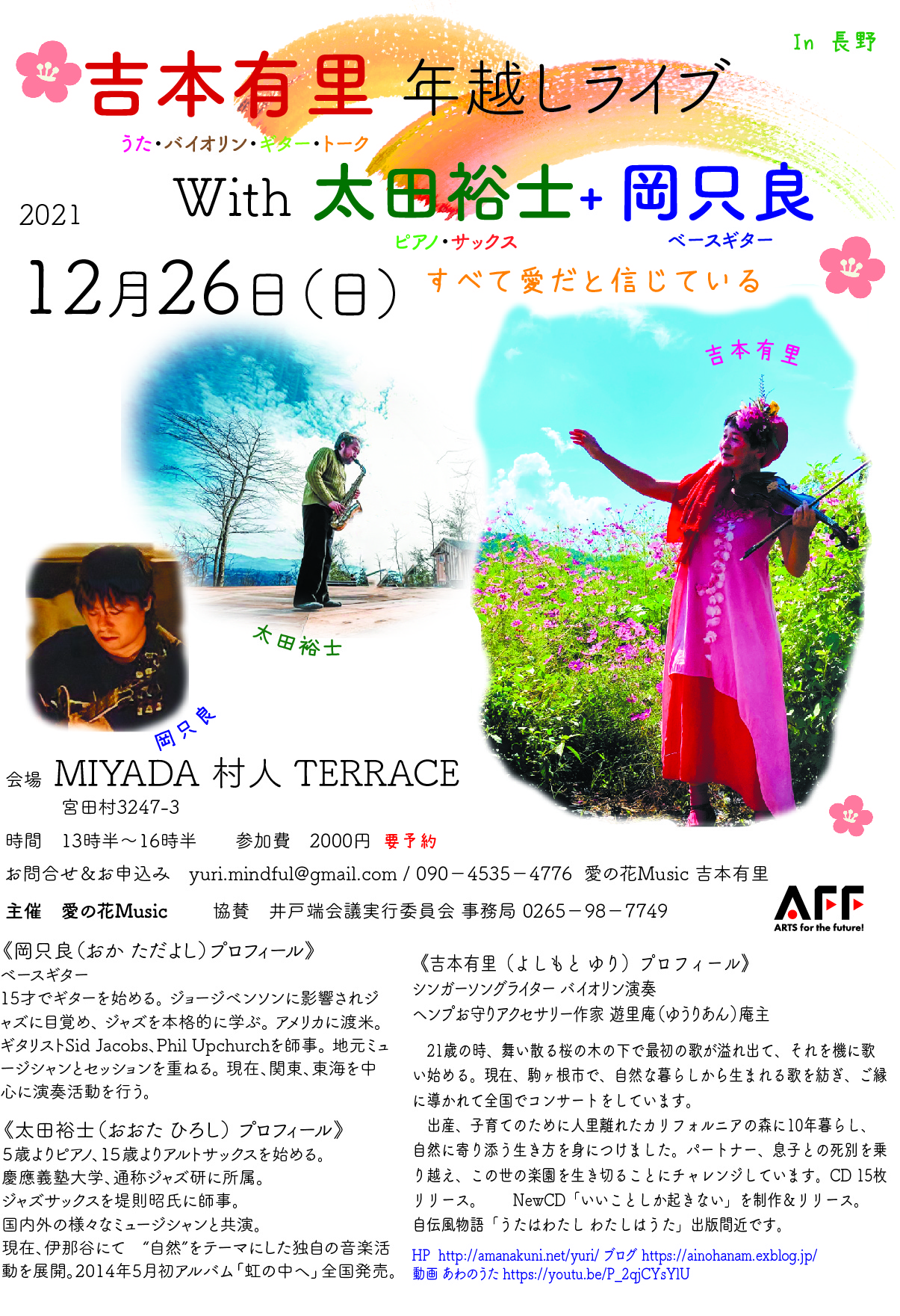 吉本有里年越しライブwith太田裕士+岡只良 →チラシ 会場 MIYADA 村人 TERRACE 宮田村3247-3 時間 13時半~16時半 参加費 2000円 問合せ&お申込み yuri.mindful@gmail.com 愛の花Music 吉本 主催 愛の花Music 協賛 井戸端会議実行委員会 事務局 0265−98−7749 |