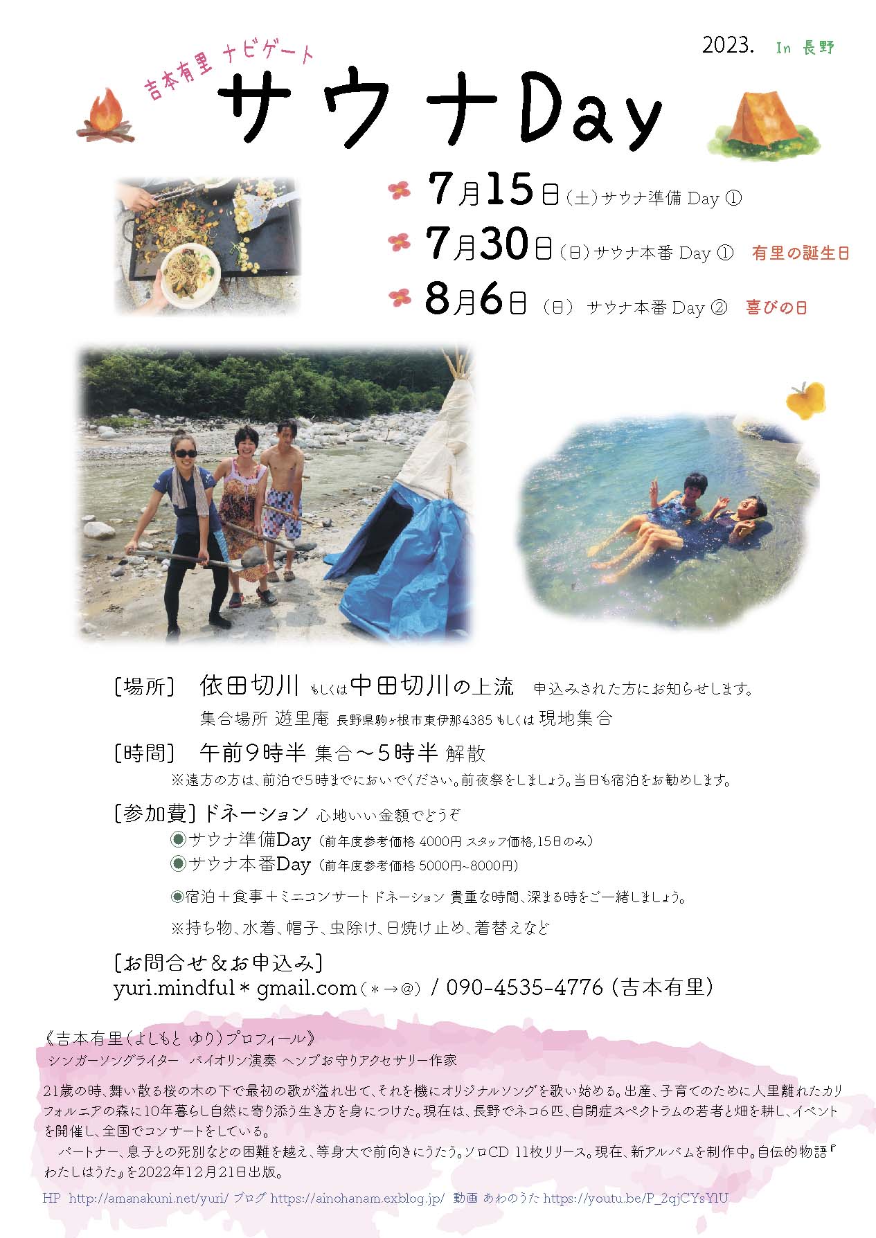 サウナ本番Day 有里の誕生日 川の源流 大きな焚き火 石を焼く 手作りサウナ 清らかなで泳ぐ 直火でバーベキュー チラシ 場所 与田切川 もしくは 中田切川 集合 遊里庵 駒ヶ根市東伊那4385 もしくは 現地集合 時間 午前9 時半 集合~ 5 時半 解散 料金 サウナ本番Day ドネーション 心地いい金額でどうぞ (前年度 参考価格5,000 円~ 8,000 円) 宿泊+食事+ミニコンサート ドネーション 貴重な時間、深まる時をご一緒しましょう お申込み&お問合せ yuri.mindful@gmail.com / 090-4535-4776 ( 愛の花Music 吉本有里) | |