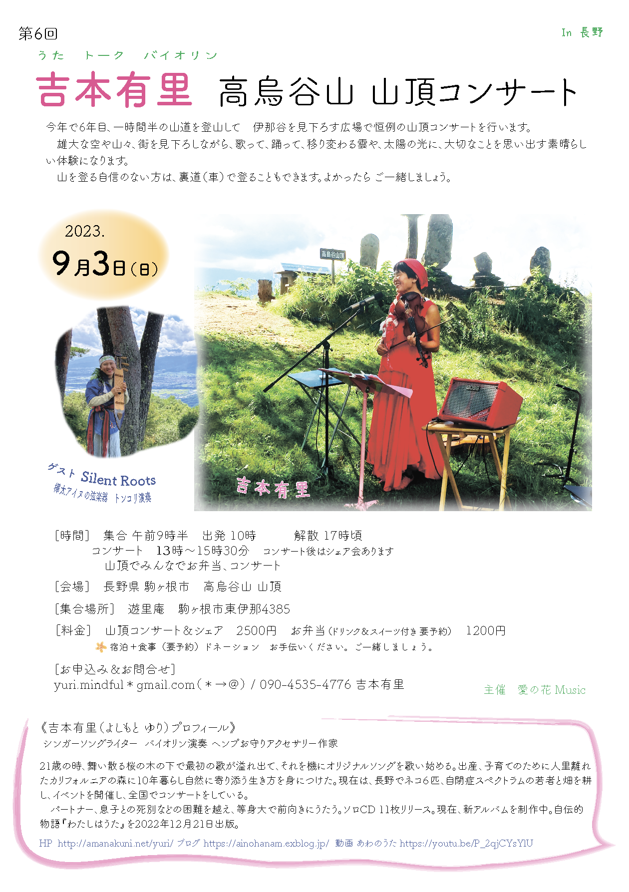 吉本有里 高烏谷山 山頂コンサート ゲスト Silent Roots 樺太アイヌの弦楽器 トンコリ演奏 山道を1時間半のぼり、頂上でランチとコンサート チラシ 場所 遊里庵 駒ヶ根市東伊那4385 時間 集合 午前9 時半 出発10 時 解散17 時頃 山頂でみんなでお弁当 コンサート 料金 山頂コンサート&シェア 2,500 円 お弁当(ドリンク&スイーツ付き 要予約) 1,200 円 宿泊+食事(要予約)ドネーション お手伝いください。ご一緒しましょう。 お申込み&お問合せ yuri.mindful * gmail.com(*→ @) / 090-4535-4776 ( 愛の花Music 吉本有里) 主催 愛の花Music |
